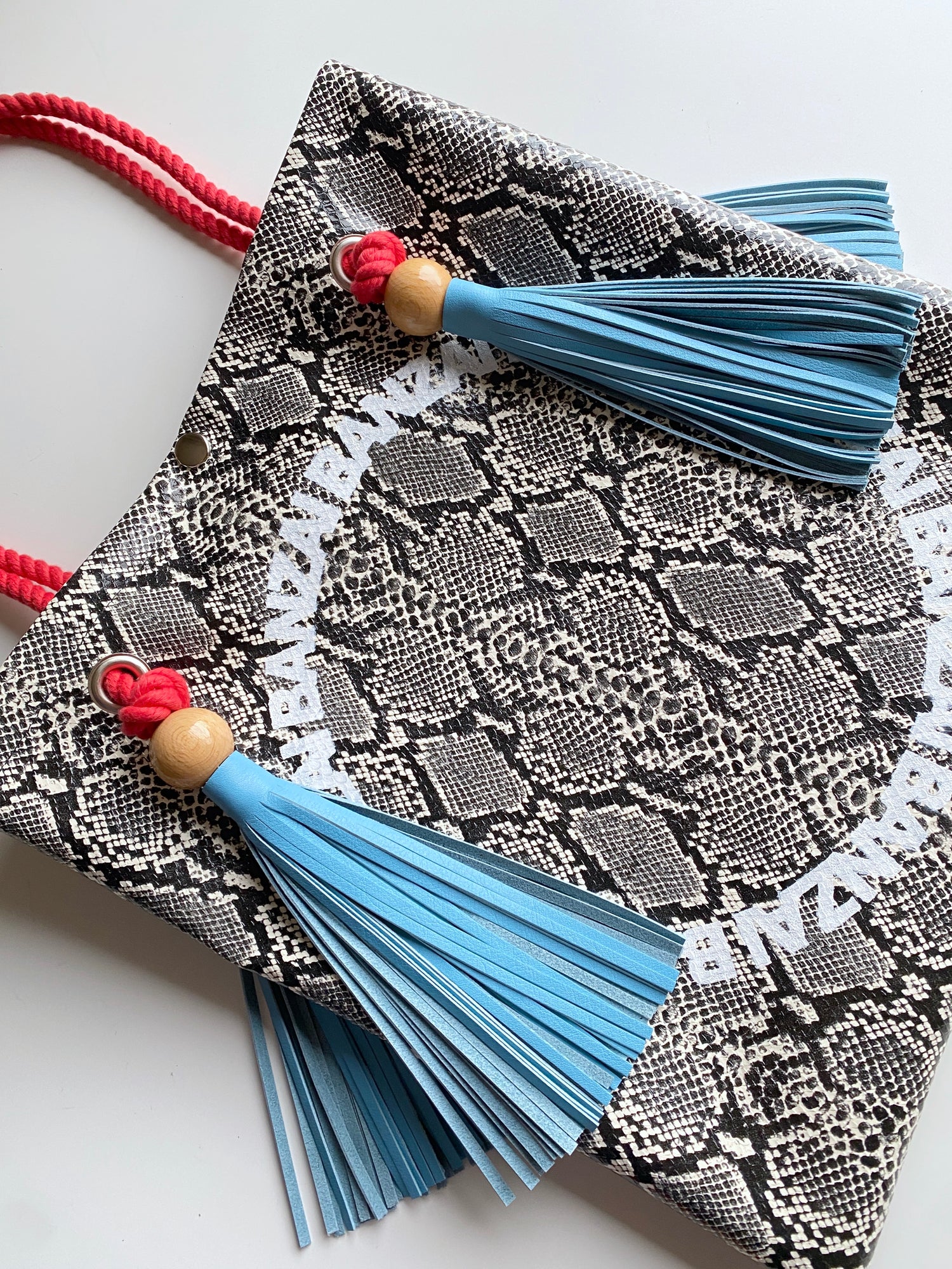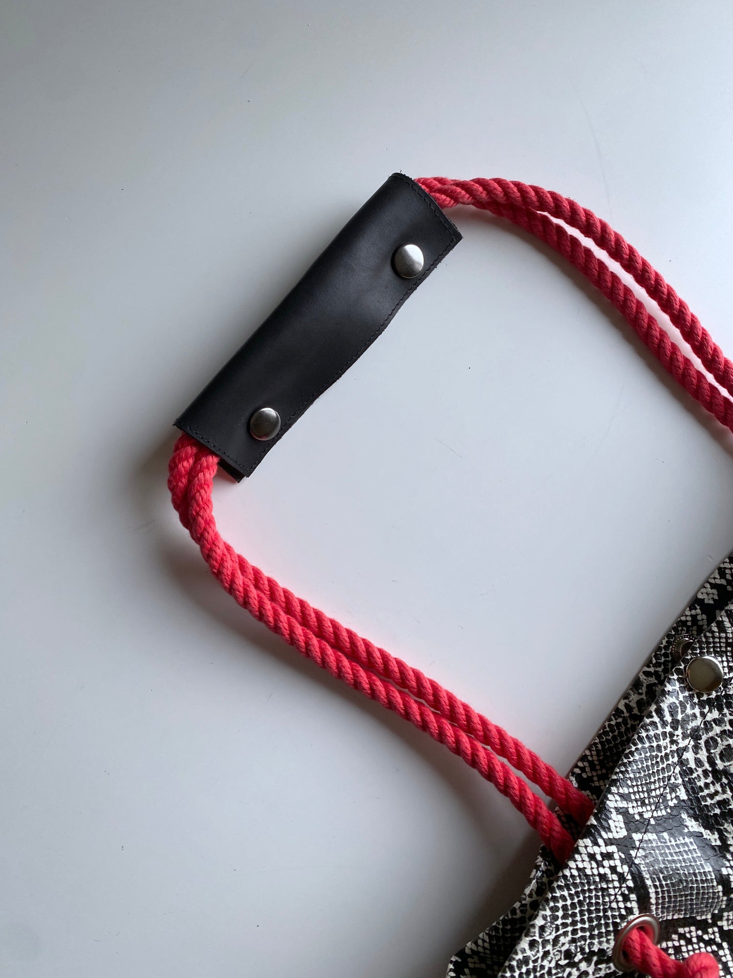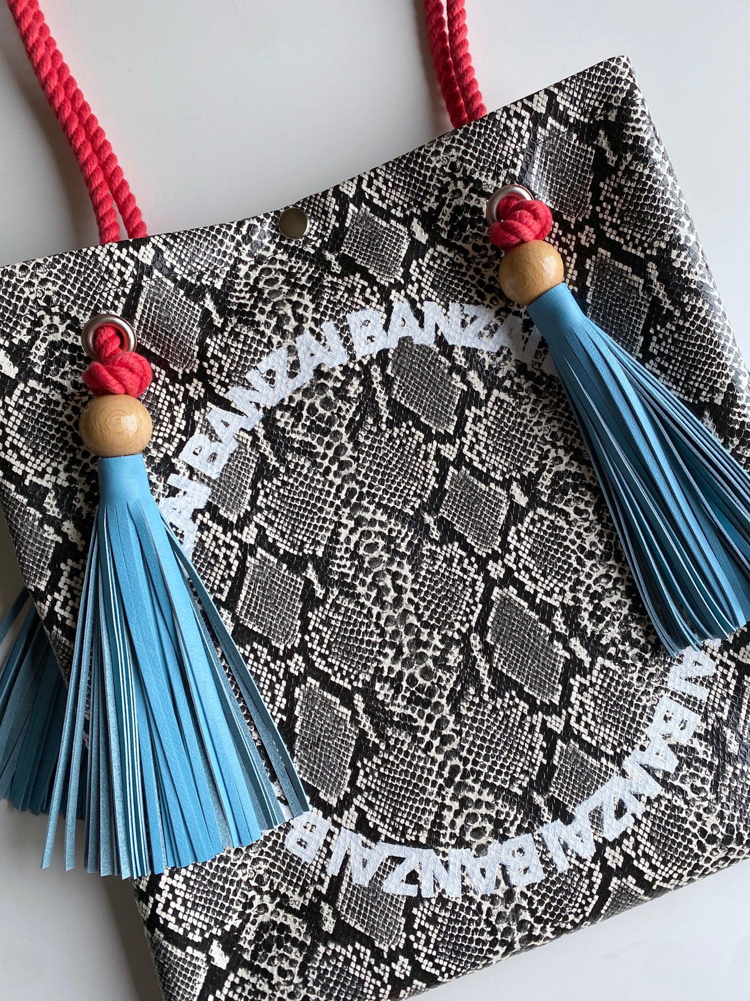合皮をベースにロープ部分に木材、牛革、合金を組み合わせたカバン。軽量且つ容量もあり、様々な場所で活用可能なアイテム。内ポケット付き。タッセル部分には形状記憶塗料を塗布しているのでカタチが崩れにくく、毛羽立ちにくい仕様となっています。持ち手部分のレザーは取り外し可能。